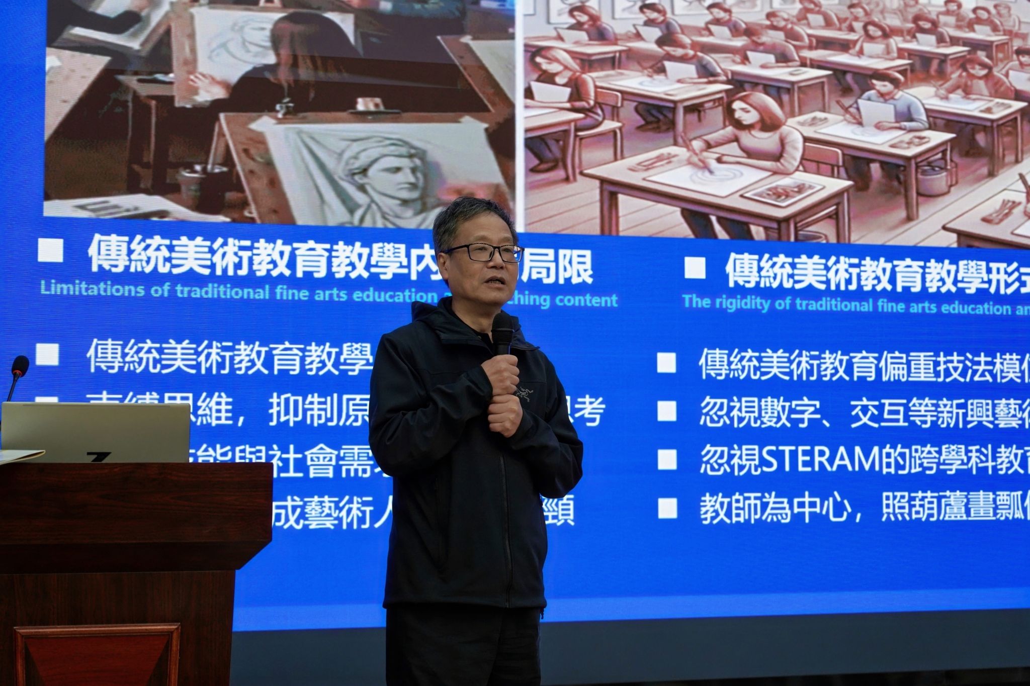 世界华人美术教育协会主席张幼云教授在致辞中指出,本届大会以“智能·人本·关爱”为主题,回应人工智能时代对美术教育提出的新挑战。他强调要在科技赋能教育的同时坚守育人本质,关注文化认同与教育公平。大会设立高等美术教育、基础美术教育与社会美术教育三大研讨板块,涵盖AI赋能创作、艺术疗愈、乡村美育等前沿议题。张幼云教授特别肯定了武昌理工学院在艺科融合方面的实践成果,并呼吁全球同仁携手探索美术教育高质量发展路径,为中华文化传承与全球美育发展贡献智慧。