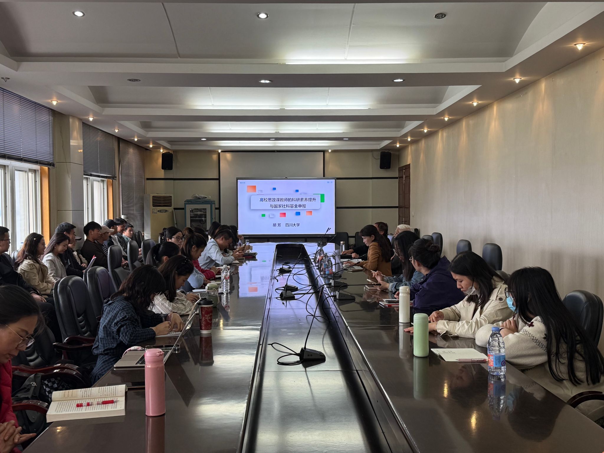 胡芳教授则以《高校思政课教师的科研素养提升与国家社科基金申报》为题,直击高校教师发展痛点。她深入剖析了当前教师在教学、科研、智库建设与收益平衡等方面面临的多重挑战,引发在场教师强烈共鸣。结合高校科研项目立项规律,胡教授强调,科研准备需扎实充分,研究切口应精准聚焦,并提醒教师在论文写作中审慎使用人工智能工具。针对2025年国家社会科学基金年度项目申报的改革创新趋势,她着重强调论文框架搭建、研究范式创新与方法论突破的重要性。在课题选择上,她建议紧扣国家战略需求、凸显学科属性、彰显研究价值,以党的二十届四中全会公报与“十五五”规划建议为重要抓手,推动“政策语言”向“学术命题”的精准转译,实现概念学理化、目标实操化、任务机制化,助力研究从“高原”向“高峰”跨越。