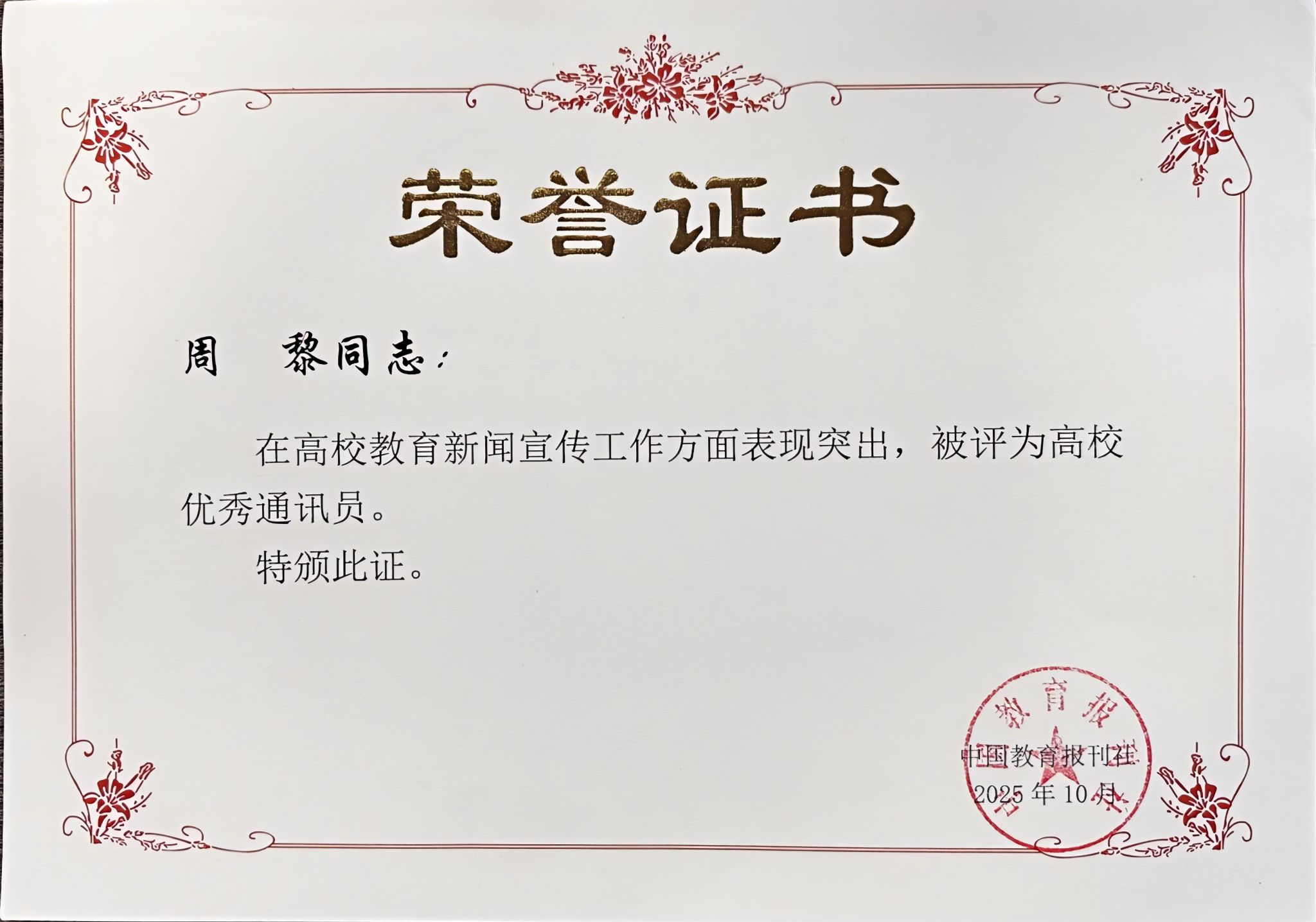 中南在线11月20日消息(记者 周墨一 报道)11月18日至19日,由湖北省教育厅宣传中心与中国教育报刊社联合举办的2025湖北教育系统培训班在武汉举行。会上,对全省教育新闻宣传战线涌现出的先进单位和个人进行表彰,武昌理工学院荣获“教育新闻宣传先进单位”称号,党委宣传部周黎同志被评为中国教育报刊社“高校优秀通讯员”。