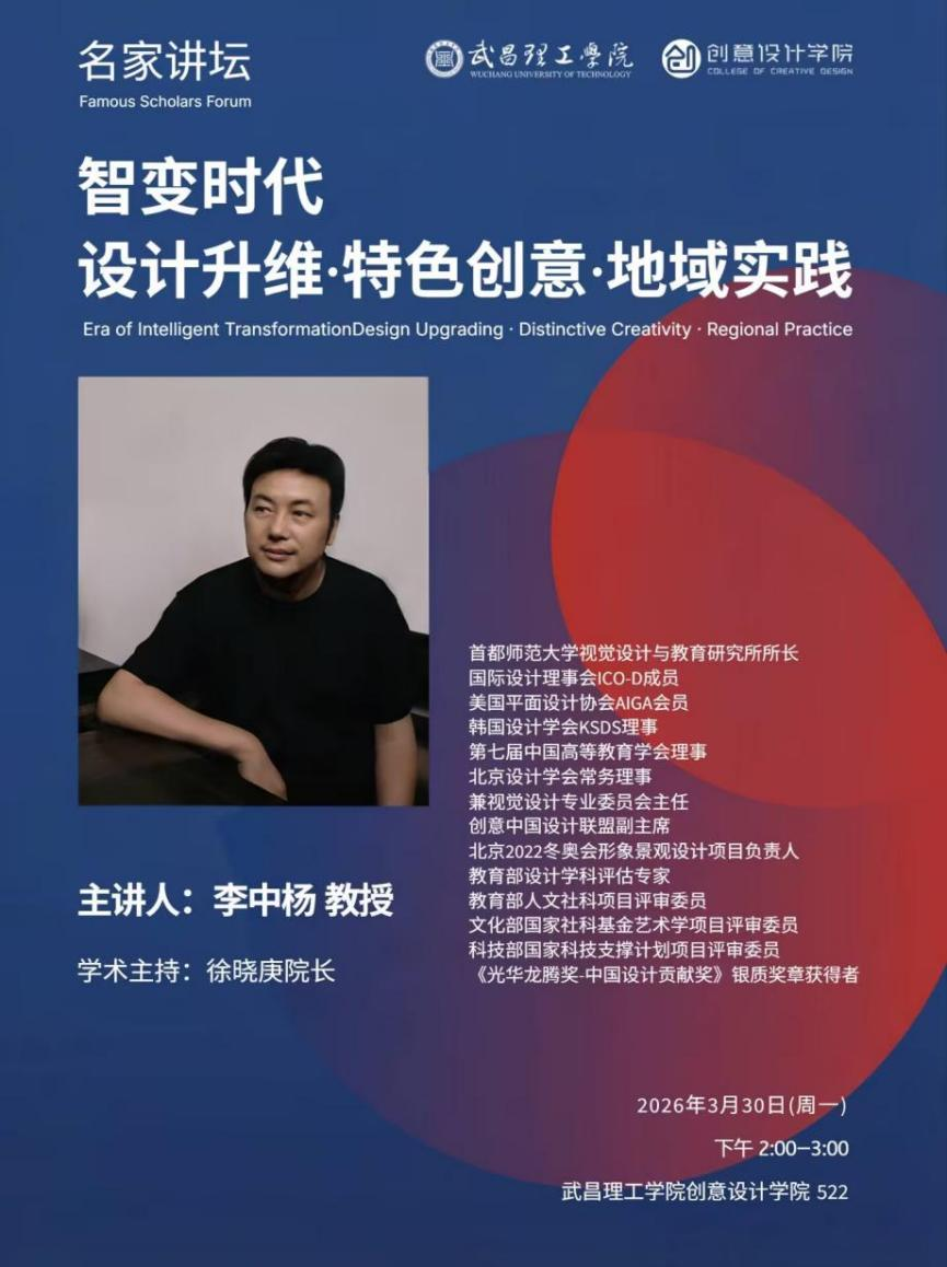 在设计教育与学术创新蓬勃发展的背景下,智变时代的浪潮正深刻重塑设计学科的边界与内涵。为助力师生把握前沿趋势、推动设计思维与实践的迭代升级,武昌理工学院创意设计学院于近日特邀首都师范大学视觉设计与教育研究所所长、博士生导师李中杨教授,举办了一场题为“智变时代 设计升纬 特色创意 地域实践”的专题学术讲座。讲座由创意设计学院院长徐晓庚教授主持,全院师生齐聚一堂,共同探索设计创新与地域融合的新路径。