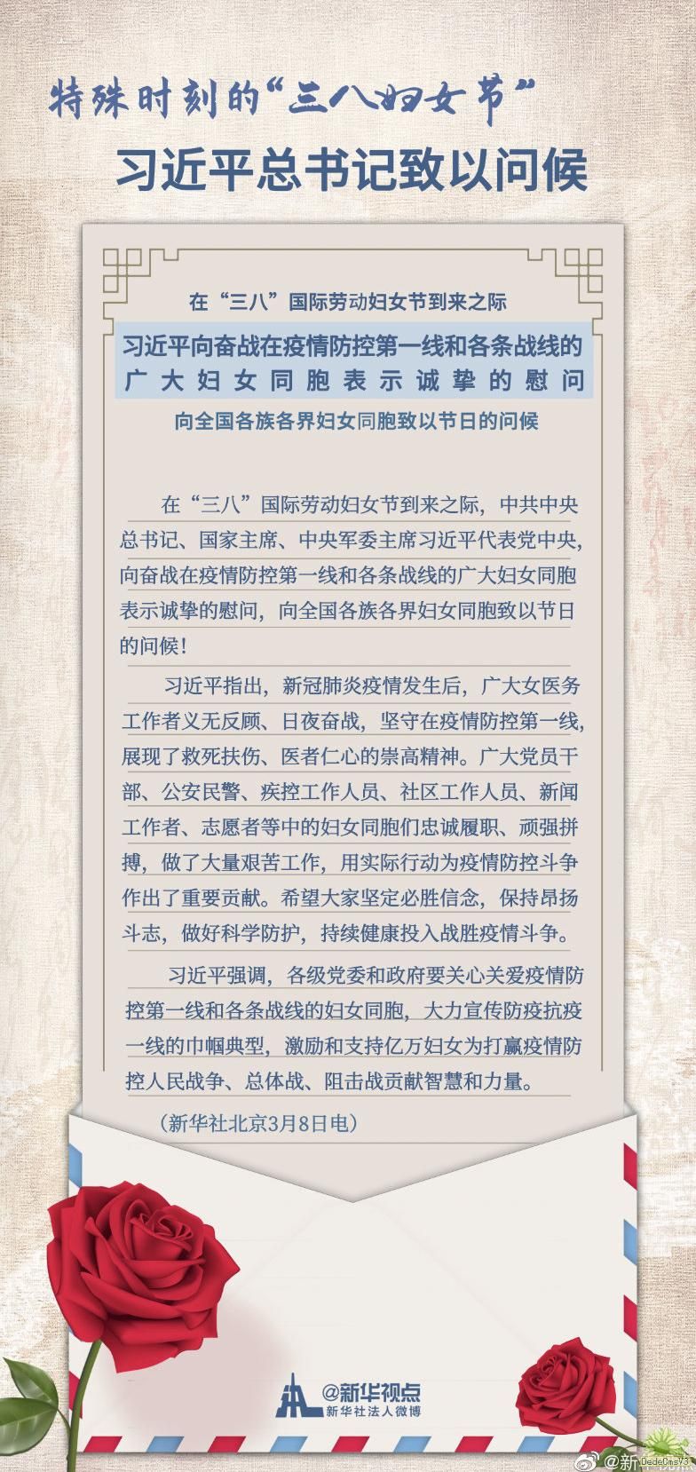新华社北京3月8日电 在“三八”国际劳动妇女节到来之际,中共中央总书记、国家主席、中央军委主席习近平代表党中央,向奋战在疫情防控第一线和各条战线的广大妇女同胞表示诚挚的慰问,向全国各族各界妇女同胞致以节日的问候!