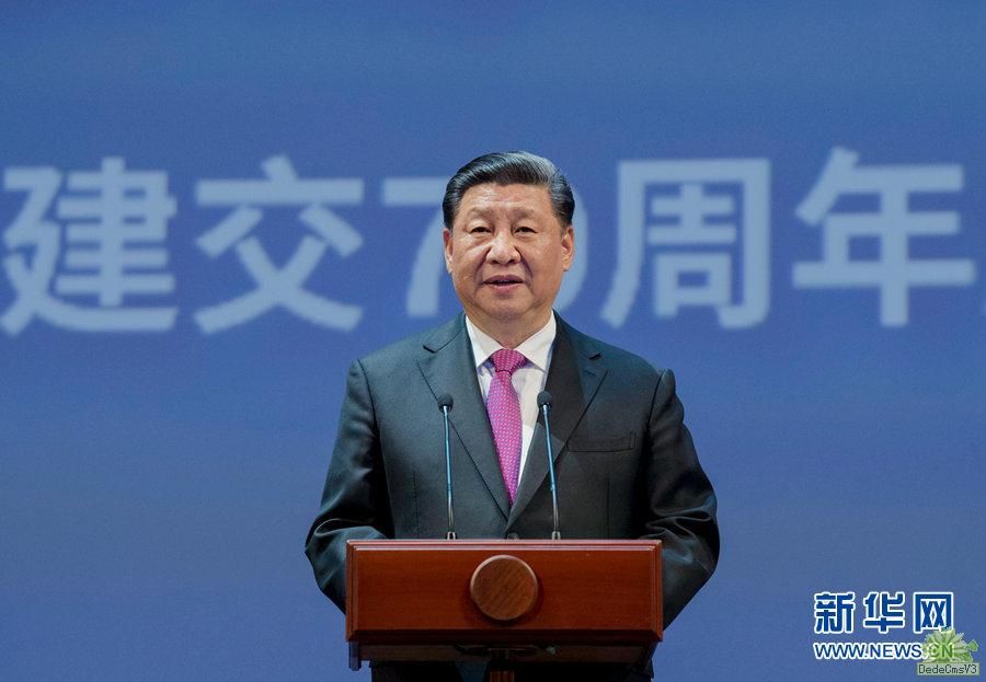很高兴同普京总统一道,来到历史悠久、举世闻名的莫斯科大剧院。70年前,毛泽东主席首次访问苏联,两国领导人正是在这里拉开了中苏友好的历史序幕。今天,我们又一次在莫斯科大剧院欢聚一堂,隆重庆祝两国建交70周年,共同迎来中俄关系又一个历史性时刻。