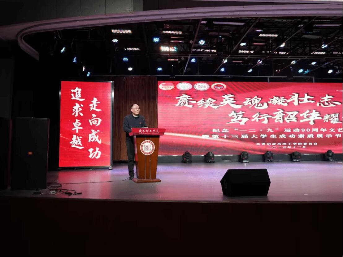 中南在线12月12日消息(大通社见习记者 梁馨仪 大通社记者 郭姿彤 闵璐 报道 摄影摄像中心 刘丽灿 陈星雨 陈禹 张欣媛 拍摄)为纪念“一二·九”运动90周年,弘扬爱国主义精神,集中展示学校素质教育成果,武昌理工学院于12月9日晚在梅南礼堂隆重举行“赓续英魂迎壮志,笃行韶华耀荣光”纪念“一二·九”运动文艺汇演暨第十三届大学生成功素质展示节闭幕式。校长助理、学工部部长李金永以及各学院党总支书记、团委书记、素质导师代表与千余名学子齐聚一堂,共赏这场融红色传承与青春风采于一体的文艺汇演。