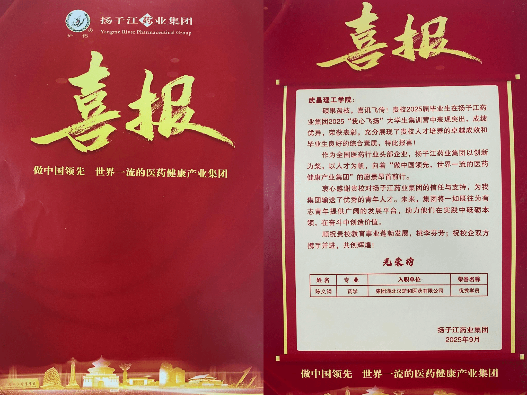 中南在线10月19日消息(大通社记者 岳佳佳 通讯员 饶梦婷 报道)近日,武昌理工学院收到扬子江药业集团喜报,祝贺生命科学学院药学专业2025届毕业生陈义钢同学,在该集团2025“我心飞扬”大学生集训营中表现卓越,荣获“优秀学员”称号。这一荣誉既是对陈义钢个人能力的高度认可,也是学校坚持立德树人、注重人才培养质量的成果体现。