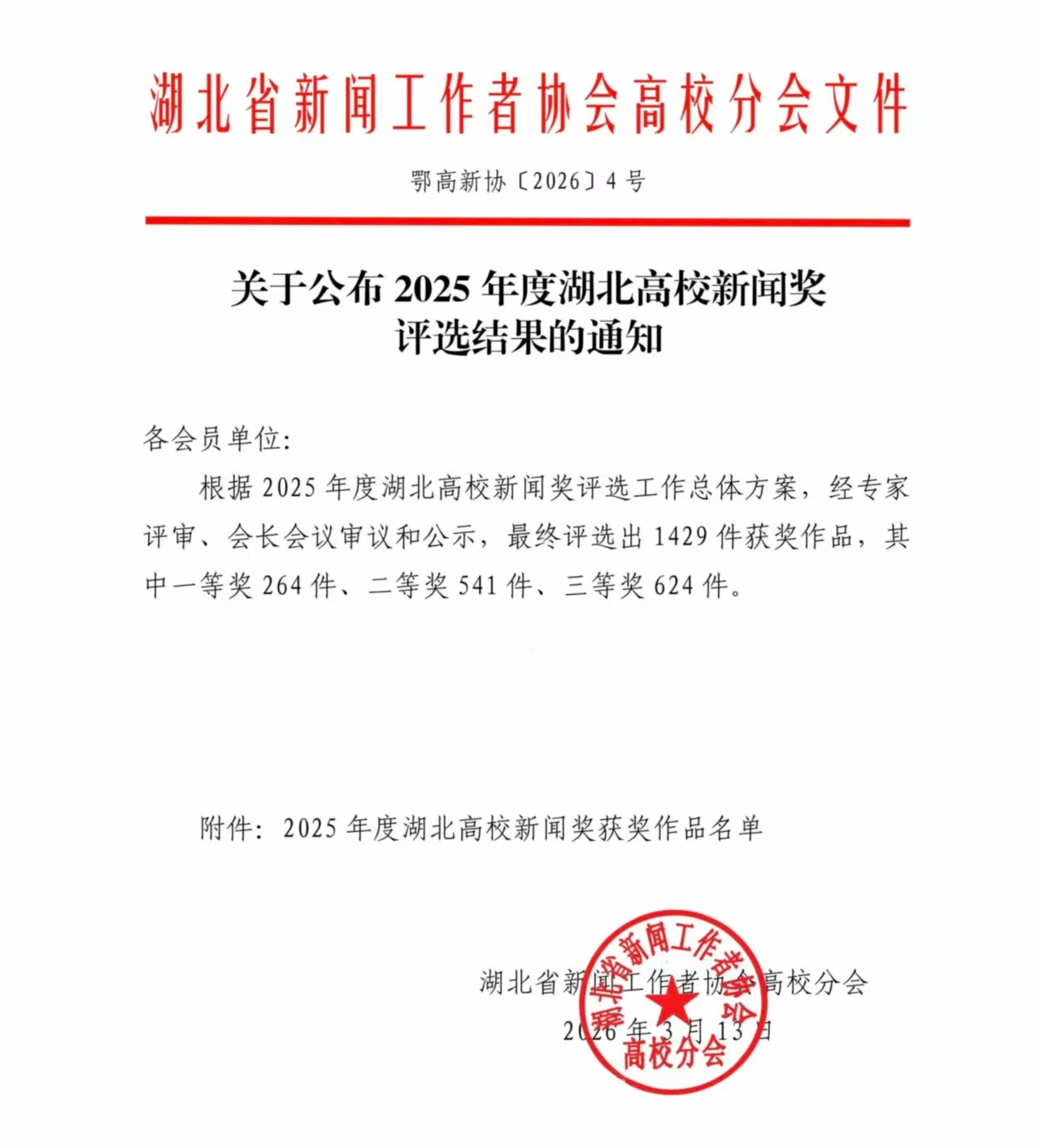湖北高校新闻奖是全省高校年度优秀校园新闻作品最高奖,每年评选一次,该奖项覆盖文字消息、文字评论、版面和页面设计、副刊、新闻摄影、广播、新闻视频、融合创新、新闻标题等多个类别,是衡量全省高校新闻宣传成效和新闻业务水平的重要标尺。