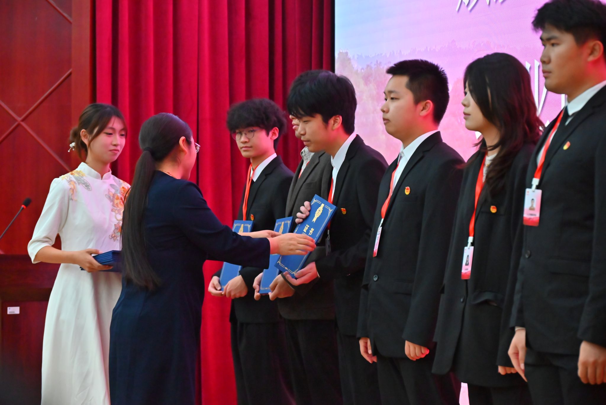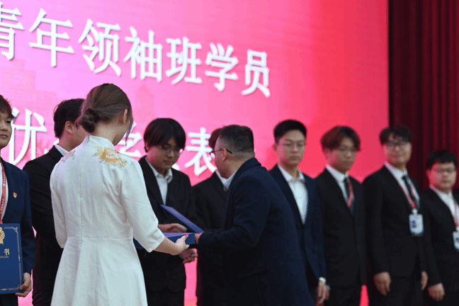 活动在庄严的国歌声中启幕。第五期青年领袖班优秀学员周凯感恩学校与师长,回顾自身成长蜕变,分享课程实践所得及个人与团队成果,并展望未来的使命与担当。随后,校长助理李金永为周凯等第五期青年领袖班学员颁发结业证书,并为优秀学员颁发荣誉证书。