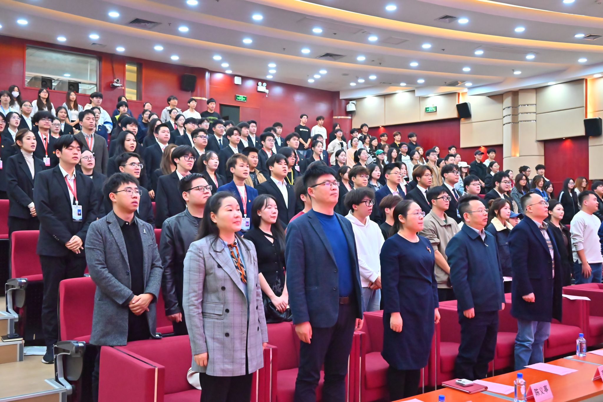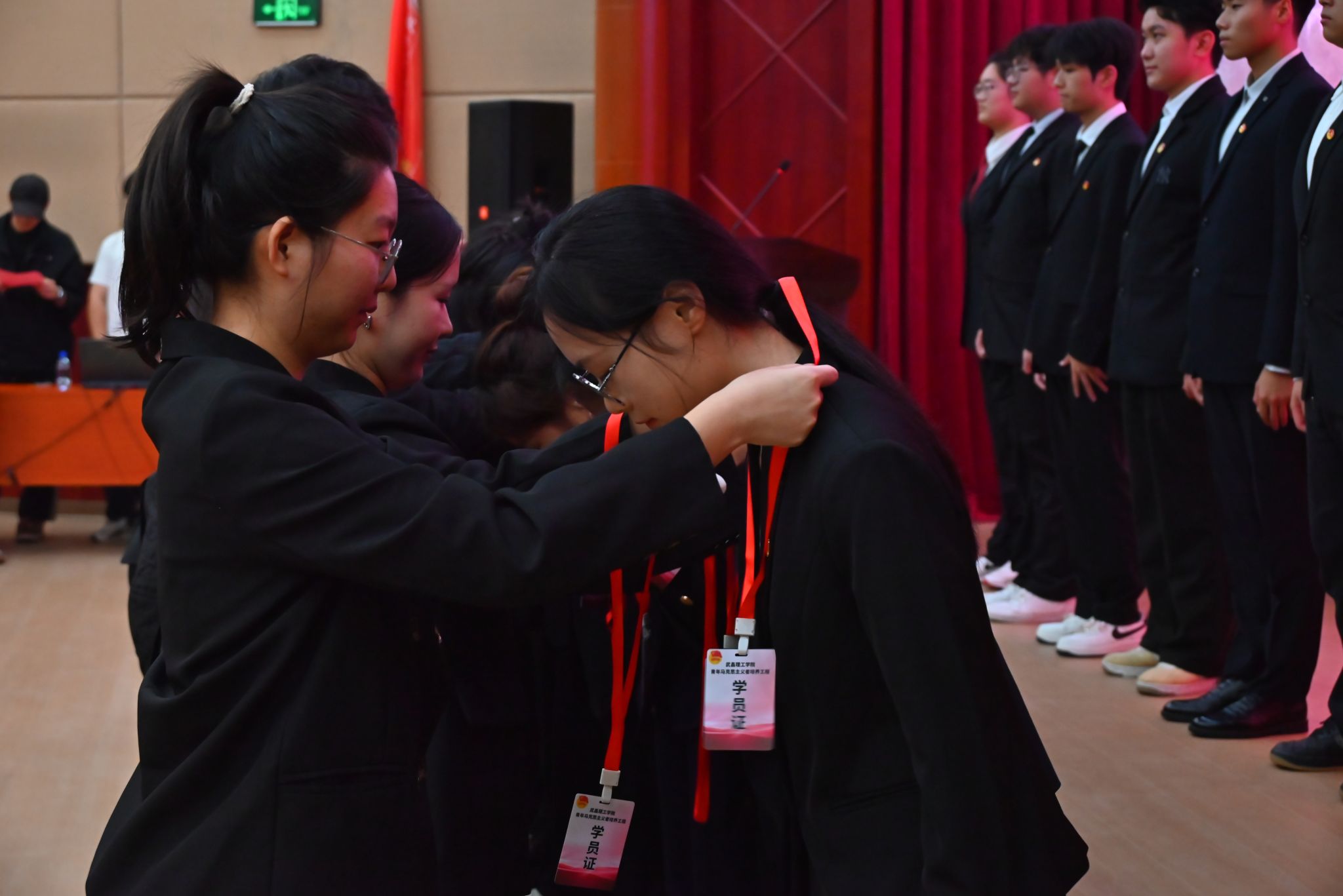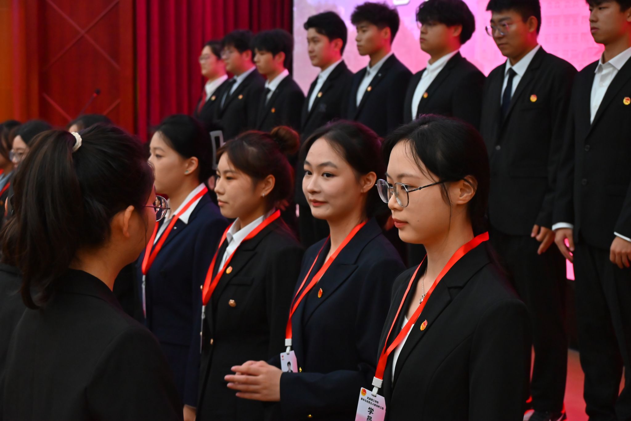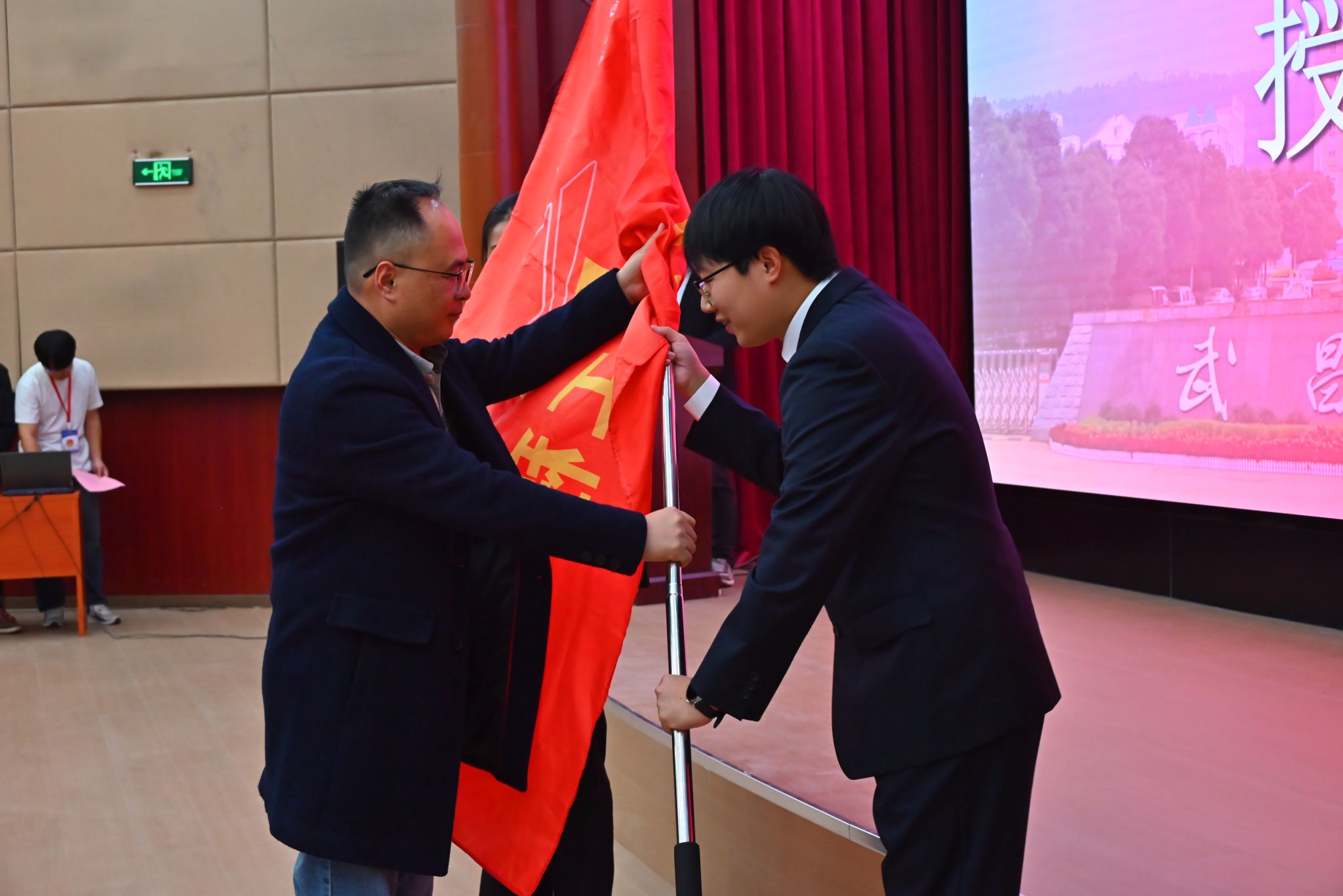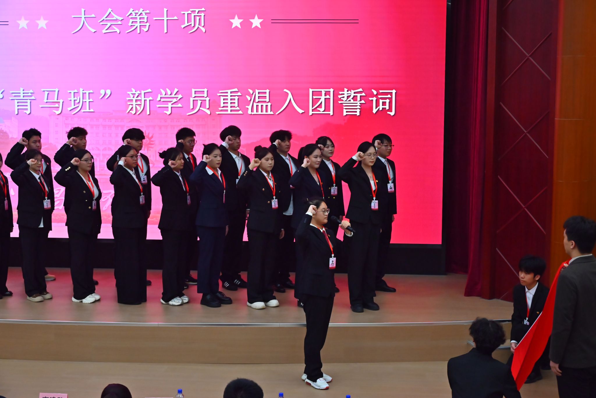 李金永校助为第九期“青马”学员授旗,第八届青马班成员代表和第九届青马班成员代表上台进行班旗交接,象征着“青马工程”责任与使命的传递。第九期“青马”学员全体上台重温入团誓词。