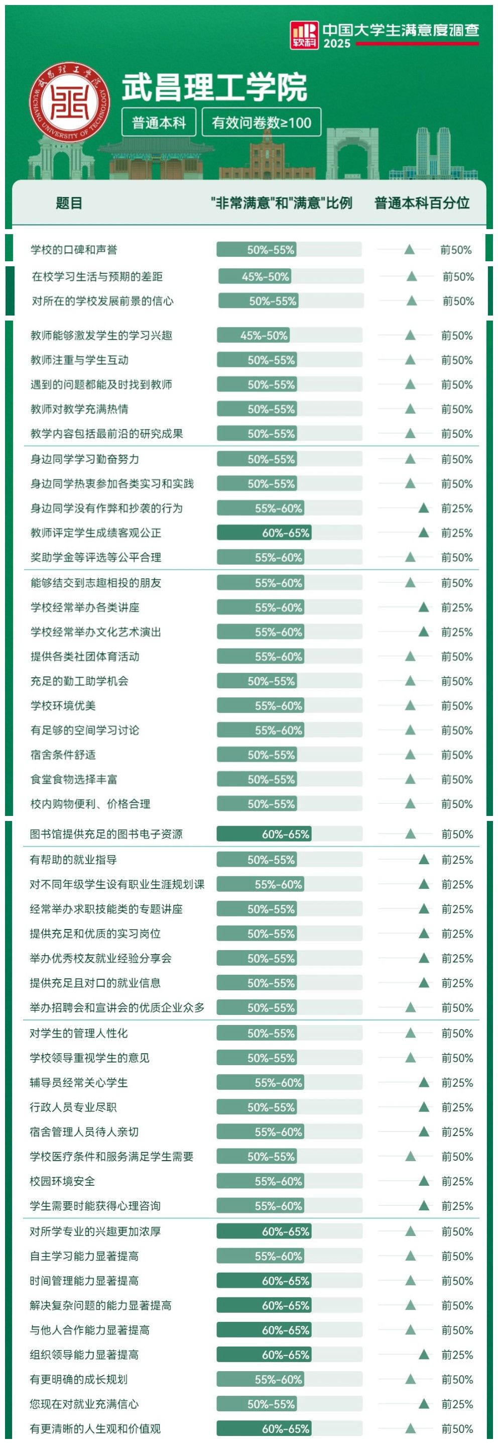本次调查历时4个月,覆盖全国2818所高校,回收有效问卷近15万份。问卷内容在学校声誉、课程教学、学风校风、校园生活、就业支持、后勤服务、成长感知、综合体验八大方面,设置了与大学学习生活密切相关的57个问题。在57项满意度评价中,武昌理工学院48项进入全国本科高校前50%,17项跻身前25%,尤其在就业指导、学术讲座、文艺演出、校园环境安全、宿舍管理、成绩评定等核心指标上表现突出。