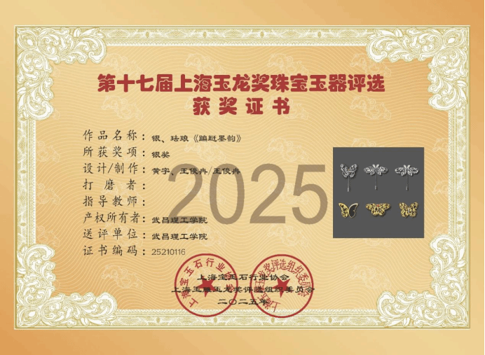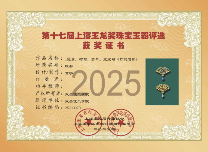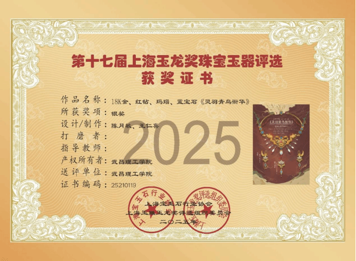 中南在线9月16日消息(大通社记者 闵璐 报道)近日,在2025年第十七届上海“玉龙奖”珠宝玉器展上,武昌理工学院创意设计学院工艺美术专业师生大放异彩,一举斩获152项大奖,包括玉龙奖银奖6项、铜奖5项、优秀奖129项、最佳创意奖3项、最佳工艺奖9项。