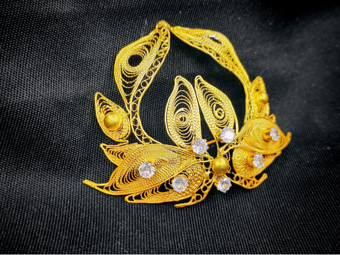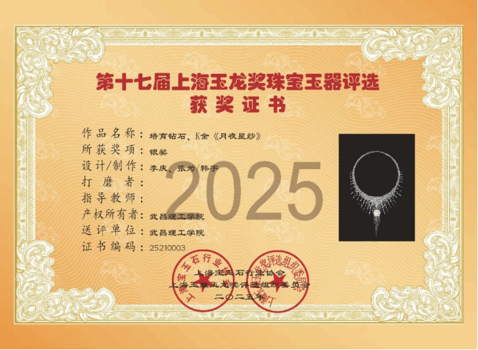 武昌理工学院学子的获奖作品类型丰富、风格多元,涵盖玉雕、金属工艺、首饰设计、手绘创作等多个门类。一批作品将传统意象与现代审美需求相融合,在材质运用、造型语言及文化表达上均体现出高水平的创新意识。其中,作品《月夜星纱》以培育钻石与K金为材,通过精湛工艺将“月夜星光”的东方诗意转化为现代珠宝语言,荣获第十七届玉龙奖银奖;它不仅展示了设计师对自然意象的敏感捕捉,更体现了当代珠宝设计对传统工艺与现代审美融合、传统美学与创新技术的平衡追求。