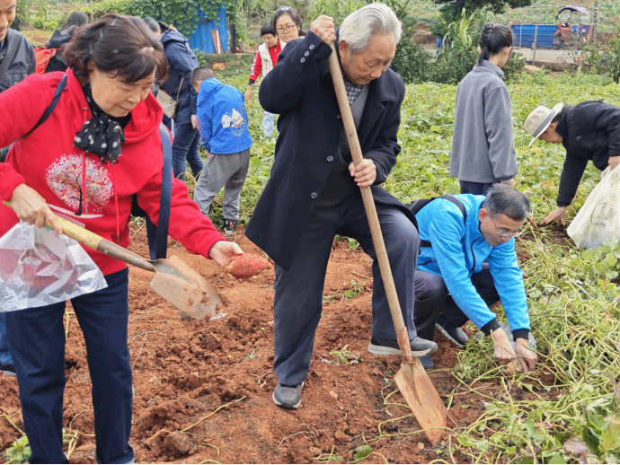 清晨,校车沿武科大、交科大、徐东、东湖中学、湖医、水果湖、茶港、鲁巷、民院、纺院、政法等多站接引参与人员,准时发车前往营地。抵达后,教练带领大家进行轻松愉快的热身活动,随后全体人员在秋色如画的田园背景前拍摄大合影,定格温馨瞬间。老教师们积极参与挖红薯、采摘蔬菜等农耕体验活动,感受秋收乐趣。