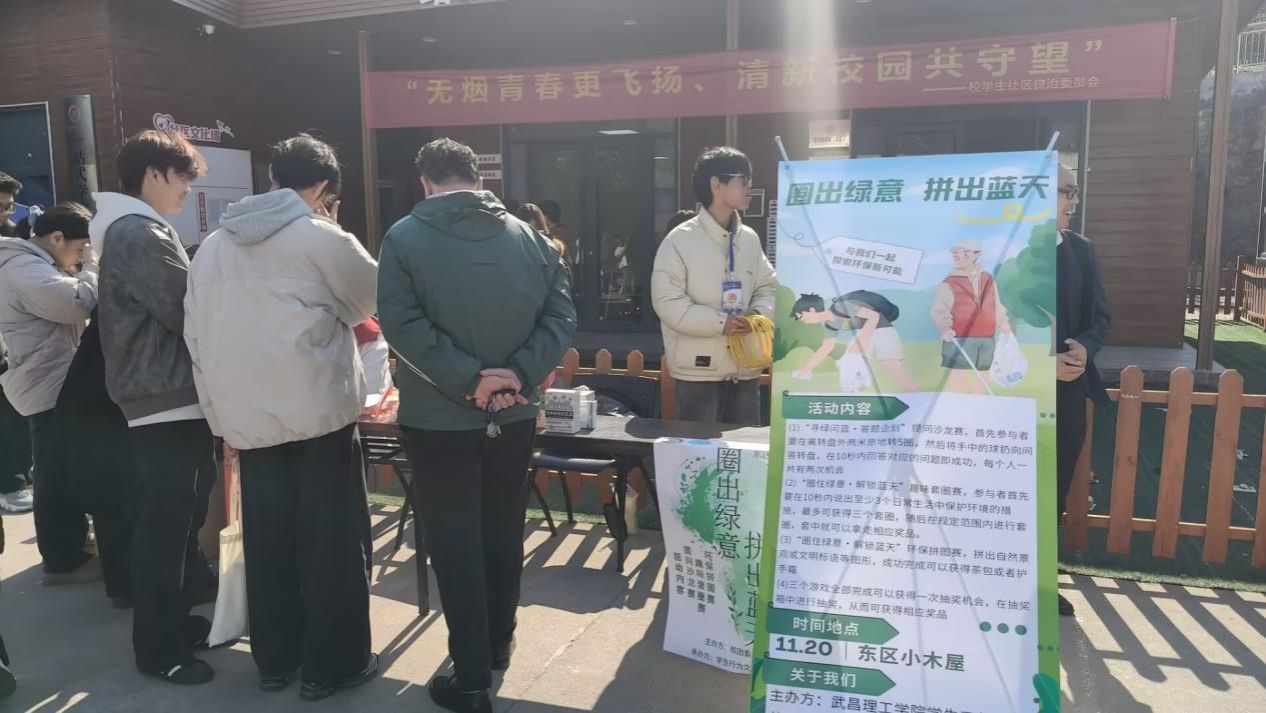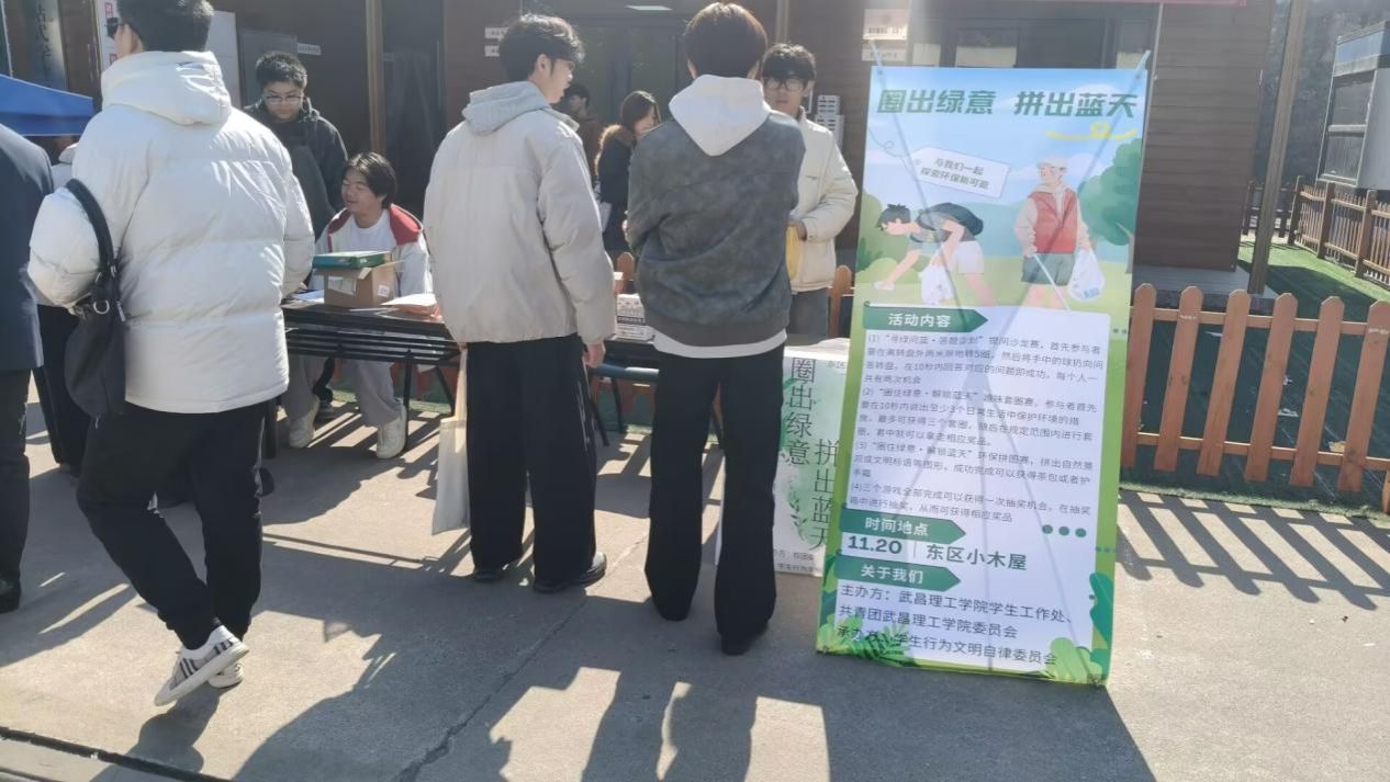中南在线11月21日消息(大通社见习记者 吴雨萱 报道 通讯员 陈明娇 摄影)为推动形成“人人护环境、文明伴我行”的校园风尚,着力改善校园环境卫生面貌、杜绝乱扔乱堆等不文明行为,11月20日,一场趣味盎然的环保主题活动“圈住绿意,拼出蓝天”在武昌理工学院东区小木屋热烈展开。