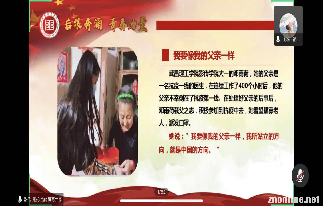 中南在线6月2日消息(通讯员 黄斌 报道)“青年是整个社会力量中最积极,最有生气的力量,国家的生气在青年,民族的未来在青年!”此时,正在腾讯会议上分享的主讲人是来自武昌理工学院影视传媒学院19级素质导师骆心怡。为深入学习贯彻《新时代爱国主义教育实施纲要》,全面落实好立德树人的根本任务,进一步培养青年学生的爱国主义情怀,6月1日下午,武昌理工学院特举办了青春战“疫”,共话成长大学生爱国主义教育公开课。此次线上公开课吸引了武昌理工学院数百名师生参与其中,并以线上云直播的方式共同收看了这堂教育公开课。