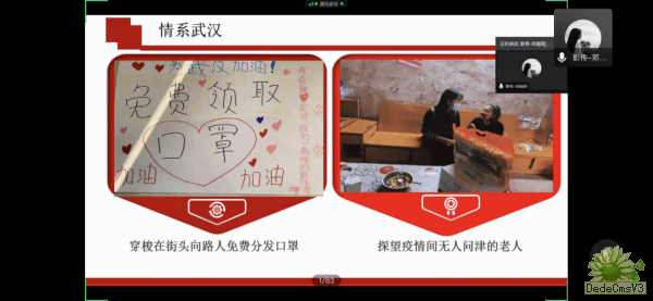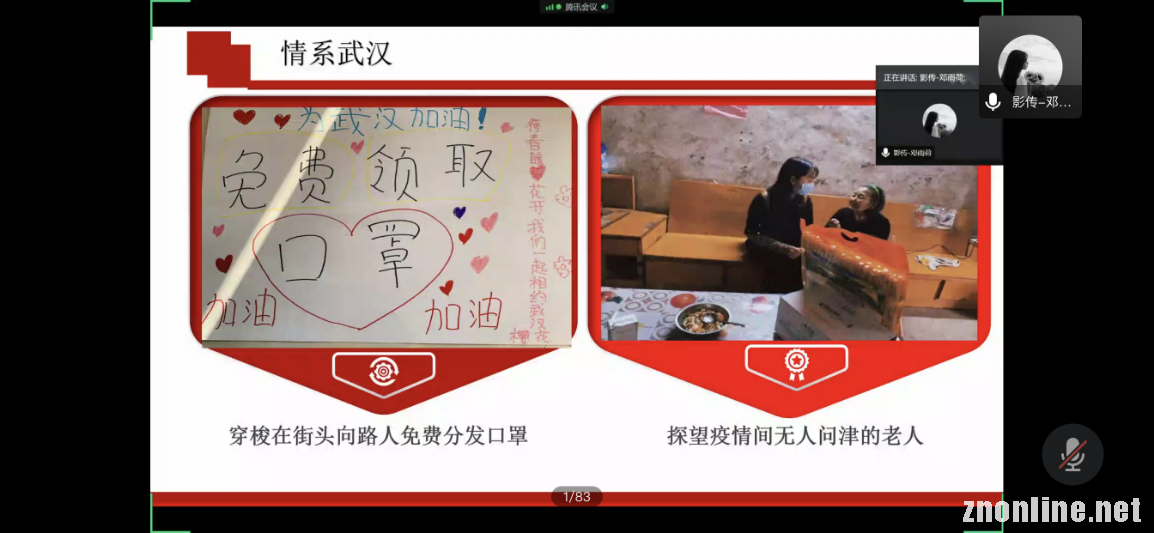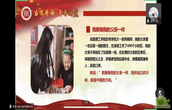 作为四位主讲人中唯一一位学生代表,影视传媒学院表演1903班的邓雨荷和老师同学们分享了自己的抗疫故事。邓雨荷的父亲是当地的一名党员医护人员,在大年三十的晚上,她的父亲毅然选择到抗疫一线,用行动践行自己从医时的那份初心,坚守在一线的岗位上四十多天。她的父亲在抗疫时曾对她说,“无论中国如何,请记得,你站立的方向就是你的中国,你怎么样,中国便怎么样;你是什么,中国便是什么;你有光明,中国便不再黑暗。”在疫情期间,邓雨荷也深深受到了父亲的影响,她精心制作了一个免费领取口罩的牌子,带着买来的200个口罩穿梭在大街小道中,给附近的居民们免费派发口罩。邓雨荷在听说附近有一个独居老人后,她及时给这位老人送去了疫情期间需要的生活物资。这一举动也让老人很感动。在全民抗疫的关键时期,邓雨荷为武汉拍摄了一条为武汉加油的短视频,在某社交平台达到了十万余人的点击率。在自己的能力范围内为疫情尽一份自己的微薄之力,对于邓雨荷说是无比欣慰的。邓雨荷说道:“我特别喜欢父亲诗里的一句话——愿为苍生尝遍苦,甘为华夏解千愁。在这特殊的时间里,我也会将父亲对我说的话牢牢记在心里,将他们对祖国的那份热爱给继续传承下去,也希望当代青年都能怀有一颗赤子之心,以青春之我,奋斗之我,去为祖国的建设添砖加瓦。”