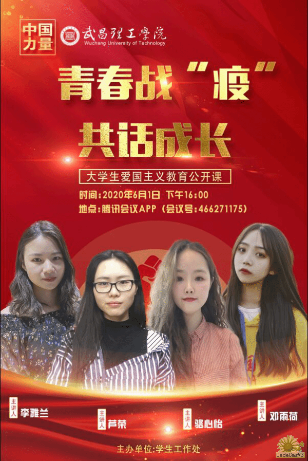 据悉,本次活动由学工处副处长汪庆作为主持人,并邀请到了四位主讲人分享他们的抗疫故事。她们分别是人工智能学院的素质导师芦荣、文法与外语学院的素质导师李雅兰、影视传媒学院的素质导师骆心怡和表演1903班的邓雨荷。