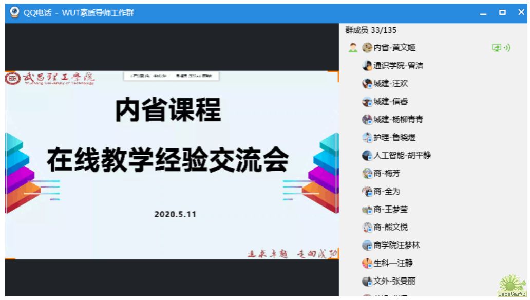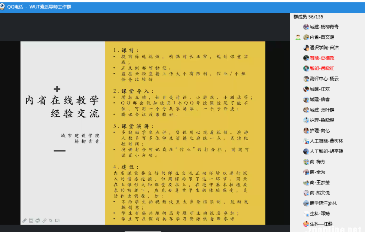 中南在线5月13日消息(大通社记者 陈宇飞 报道)为保证《内省》在线教学质量,提高教师信息化教学技能和教学水平,5月11日下午,武昌理工学院所有内省授课教师通过QQ群语音分屏方式,参加了《内省》课程在线教学经验分享交流活动。活动由通识素质教育学院《内省》课程负责人黄文姬主持。