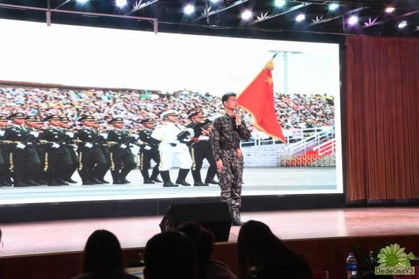 下午13时整,竞赛准时开始,第一位上场的选手是武汉纺织大学的南畅同学,她用她加入“青春护农”队走遍全国十余个省市县城的经历,用情景再现的方式,为在场的观众再现了丝绸之路经济带的繁华,结尾用一段歌舞展现了古代丝绸之路的古都风韵,其作品让在场同学深受喜爱。还有一位来自长江工程职业技术学院的高浩祥同学,其讲述了他与国旗的故事。担任校国旗护卫队队员的他对国旗和队旗有着不一样的感情,或许是一种信仰,或许爱国旗是爱祖国的另一种表达,演讲最后,高浩祥和队员们为在场观众展示了国旗,统一的步伐,娴熟的动作,在场观众拍手叫好。一位身着军装的选手从登场是来自黄冈师范学院的王海飞同学,曾经的他携笔从戎是一名中国人民解放军,用视频和表演为在场观众展现了一次惊心动魄的实教任务。最后他连呼三声:“祖国有我在,请您放心!祖国有我在,请您放心,如果有我在请您放心”。