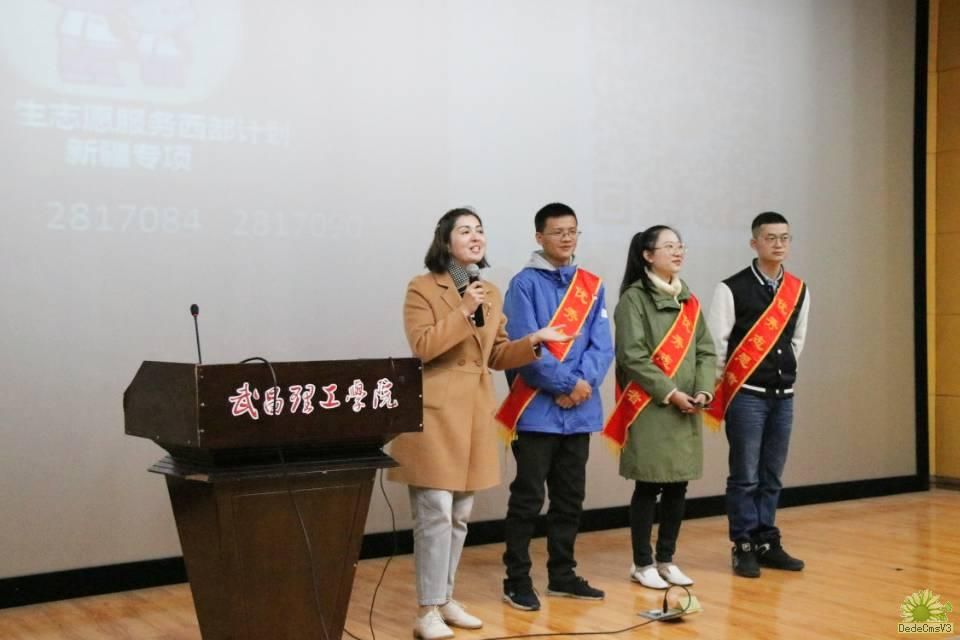 开场前大屏幕播放了大学生志愿服务西部计划服务新疆专项招募视频短片。会议开始首先由三位志愿者分别介绍自己在新疆各个地区的工作与生活,讲述了他们关于青春、梦想、责任与奉献的故事,全方位为同学们分享了志愿服务活动的实践感悟,他们的勇敢、坚强、执着和无畏的精神、支教新疆学校的决心、服务于西部人民的理念与经历感动了同学们,也激励着同学们。