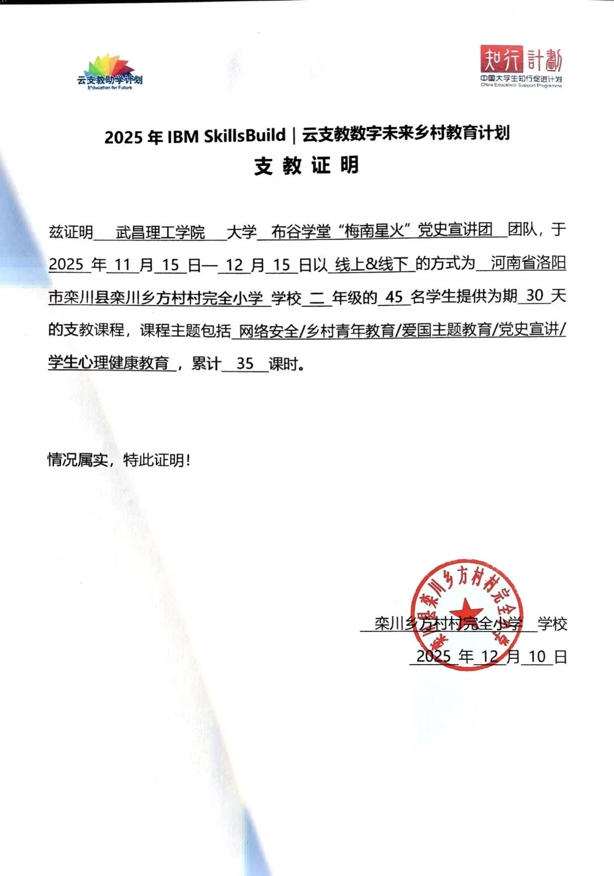 IBM SkillsBuild云支教计划是由中国大学生知行促进计划联合IBM发起的全国性公益项目,旨在推动数字技术与乡村教育深度融合。本次活动吸引了全国75所高校、100支团队参与,2131名大学生志愿者走进26个省市100余所乡村中小学,累计开展5833课时公益课程,惠及1.8万余名乡村学生。经多轮评审,武昌理工学院商学院布谷学堂志愿者协会凭借扎实的服务成效与鲜明的红色教育特色,成功斩获这一国家级荣誉。